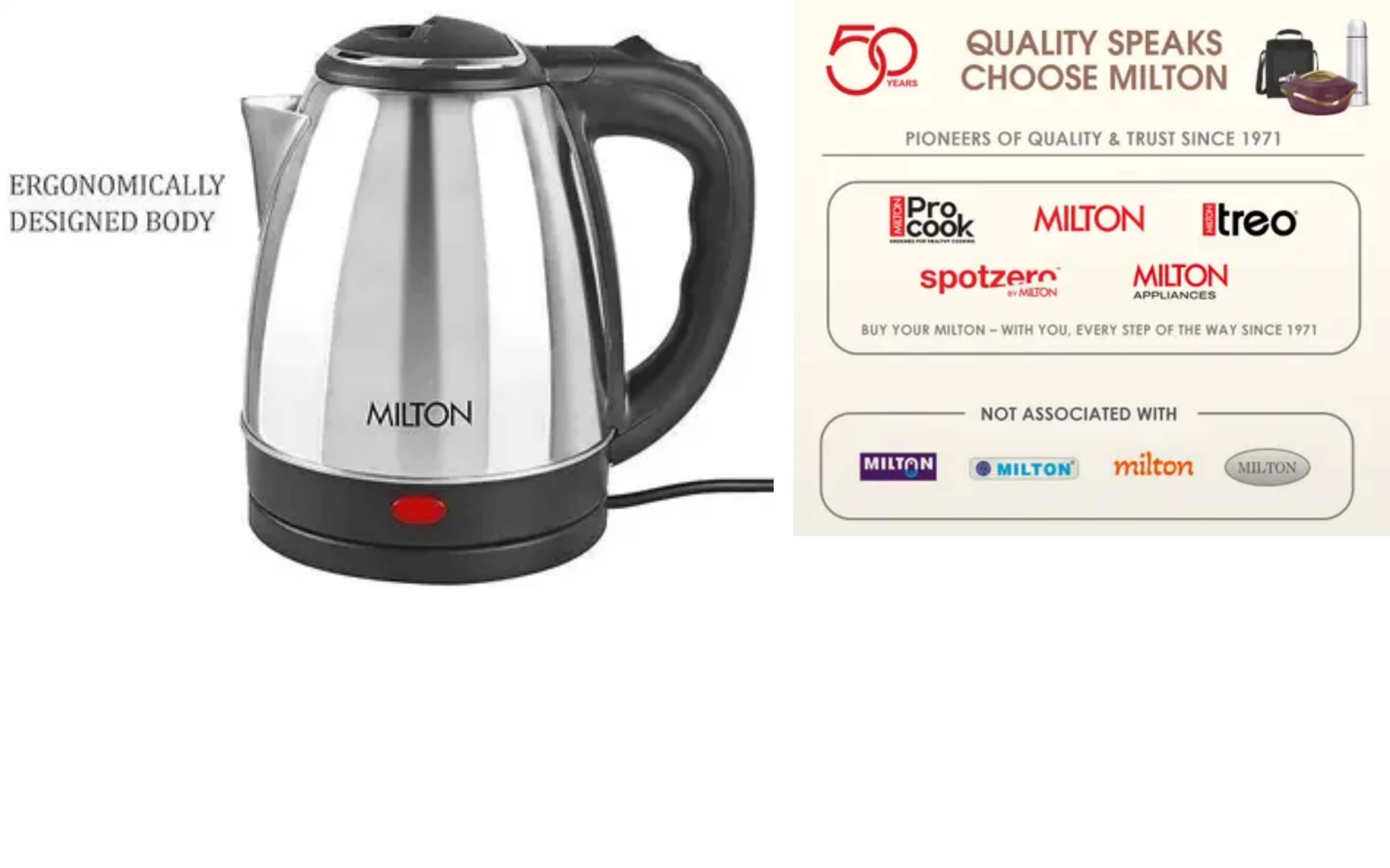 • The Milton Electro Electric Kettle is your perfect partner for fast, safe, and effortless boiling. Crafted with a premium stainless-steel body and a stylish modern design, it not only enhances your kitchen look but also offers long-lasting durability.